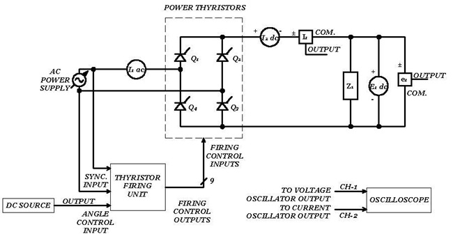 (7) Set up the circuit of Figure 12 using the resistive load Z (a). To simplify connecting the thyristors, set both interconnection switches on the Power Thyristors module to the 1 position.