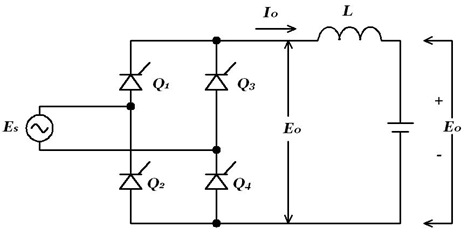 The single-phase thyristor bridge can be used both as a rectifier and as an inverter. The inductor is large enough to ensure continuous conduction over a wide range of firing angles. The power supplied to the battery is P0 = I × E0, where E0 is the average dc voltage at the output of the bridge.
